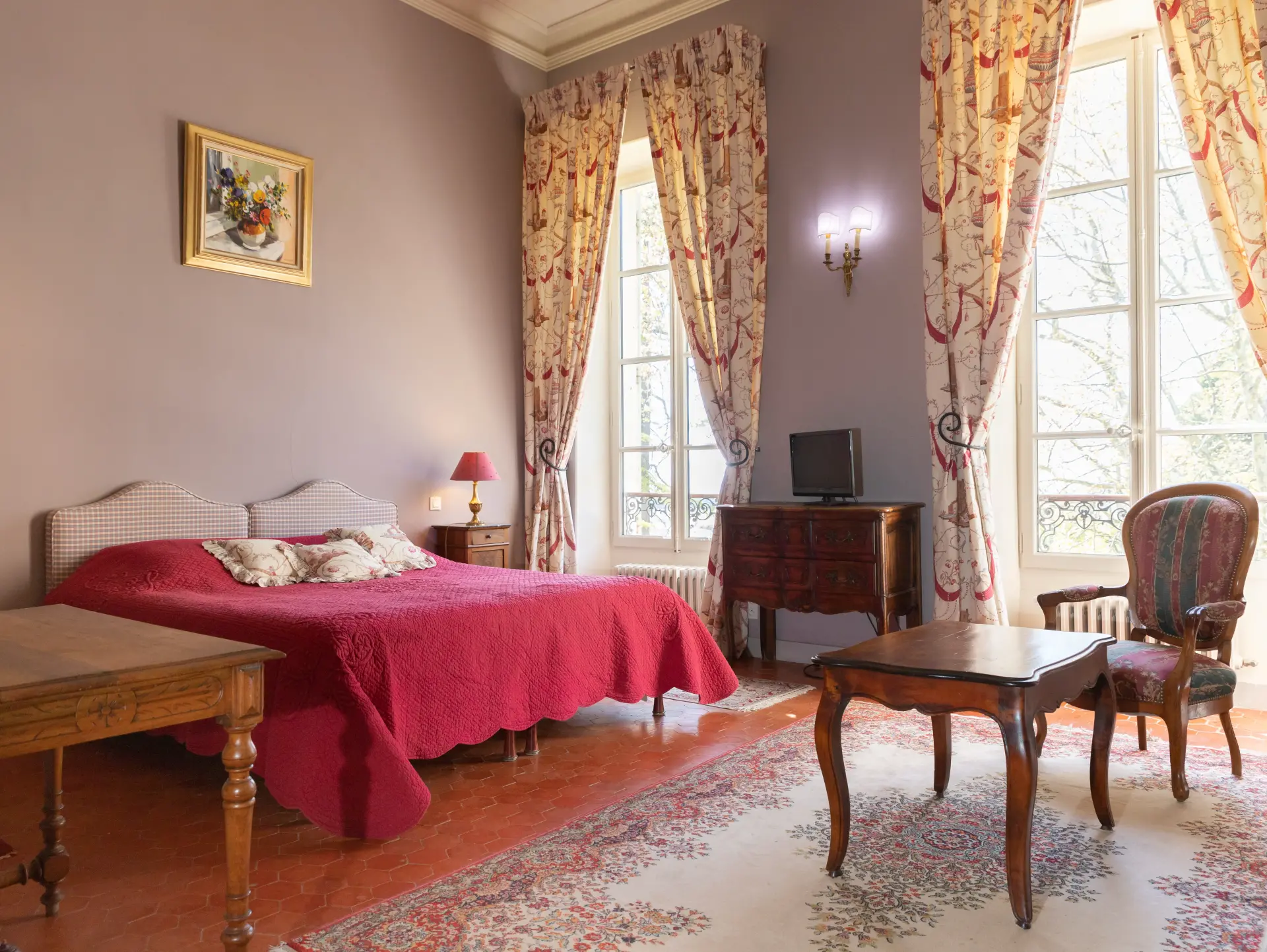 Décorée dans des tons chaleureux, dans un style très provençal, la chambre Cerise, séduit par son raffinement et son authenticité. Les grandes fenêtres habillées de rideaux Pierre Frey donnant sur le parc vers le sud, le coin salon avec ses fauteuils du XIXe et son tapis, près de la cheminée surmontée d'un trumeau d'époque Napoléonienne, donnent beaucoup de charme à cet hébergement tout confort au cœur de la Provence.